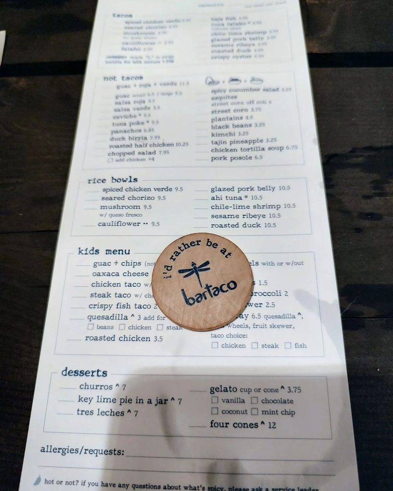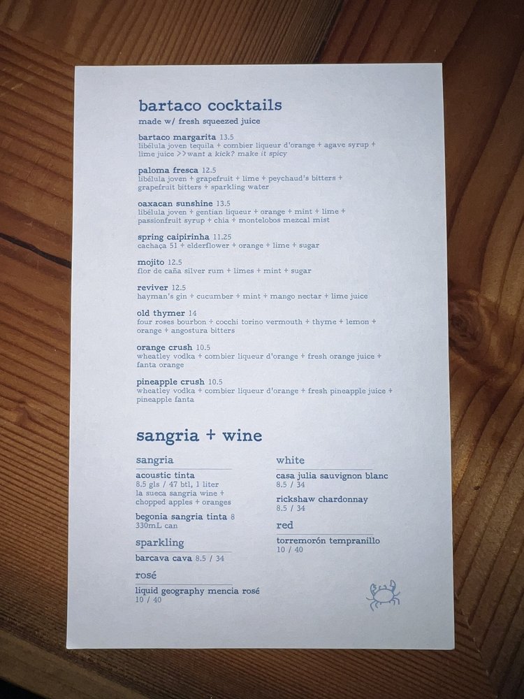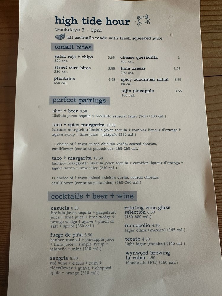 Bartaco is a vibrant Mexican eatery located at 282 NW 25th St, Miami, FL. This bustling spot invites diners to indulge in a unique culinary experience inspired by the beach culture of Mexico. The menu is expertly crafted, highlighting a selection of flavorful tacos alongside fresh, seasonal ingredients.